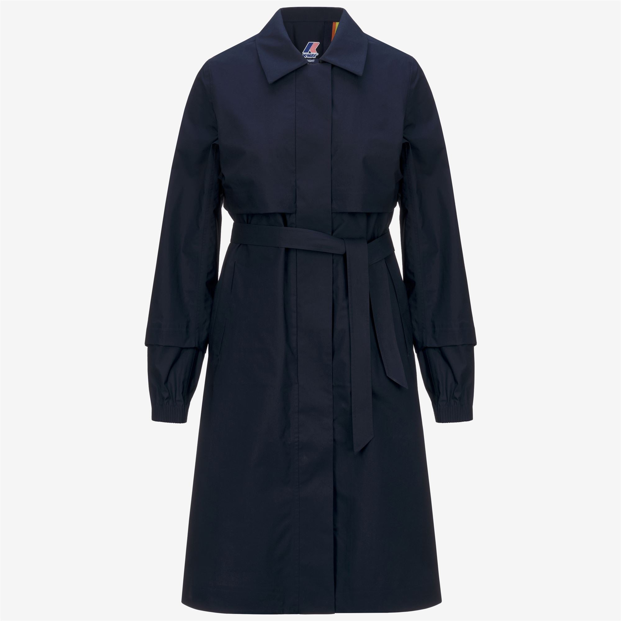 Jesy is a women's full-length jacket, an outerwear piece with a timeless urban appeal designed for the spring weather, made of 3-layer cotton poplin with a jersey lining and the technical style accent of contrasting heat-taped seams. The jacket features a classic collar, a flap-covered zip, and a tone-on-tone belt at the waist.