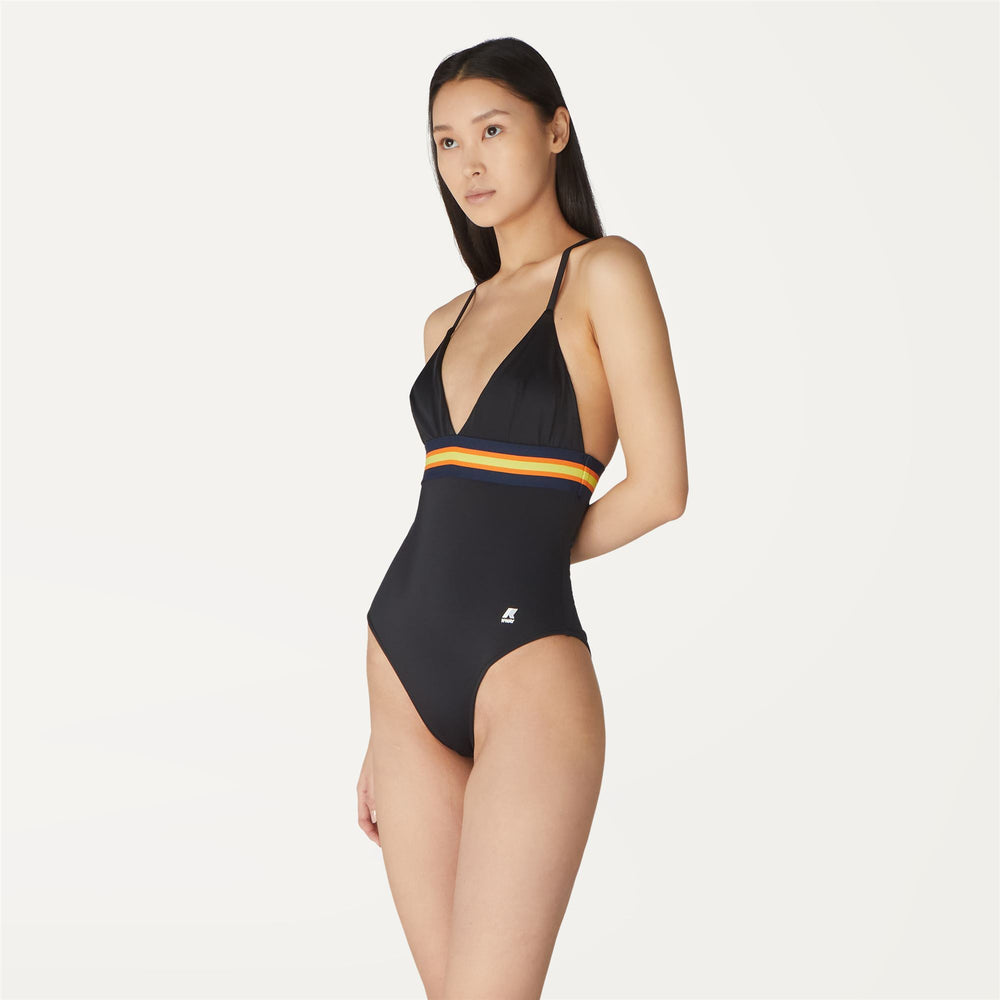 El bañador Katline presume de un diseño ultra-femenino con sutiles matices vintage, caracterizado por un escote en V que alarga la silueta y tirantes delgados que se cruzan en la parte posterior. Confeccionado con lycra® de secado rápido, se ajusta debajo del busto con una banda a rayas que recuerda a la icónica cinta de K-Way.
