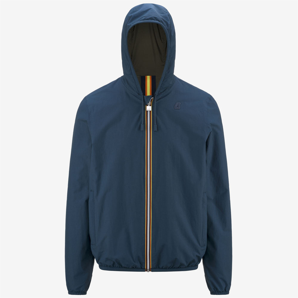 Chaqueta corta y ajustada para hombre, reversible. Lado A en nylon ripstop, impermeable, transpirable y cortaviento. Lado B en nylon. Se abre en la parte frontal con una cremallera K-Way completa, accesorios K-Way personalizados. Dos bolsillos ocultos insertados a ambos lados. Capucha fija ajustada con un cordón elástico con regulaciones ocultas. Puños elásticos. Etiqueta QR en el interior. Logo K-Way de silicona colorido autoadhesivo.