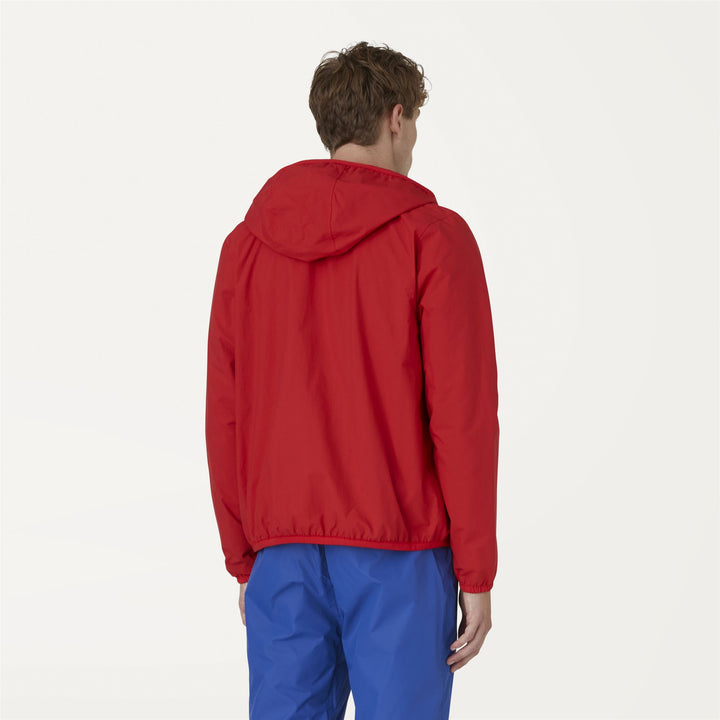 Chaqueta corta y ajustada para hombre, reversible. Lado A en nylon ripstop, impermeable, transpirable y cortaviento. Lado B en nylon. Se abre en la parte frontal con una cremallera K-Way completa, accesorios K-Way personalizados. Dos bolsillos ocultos insertados a ambos lados. Capucha fija ajustada con un cordón elástico con regulaciones ocultas. Puños elásticos. Etiqueta QR en el interior. Logo K-Way de silicona colorido autoadhesivo.