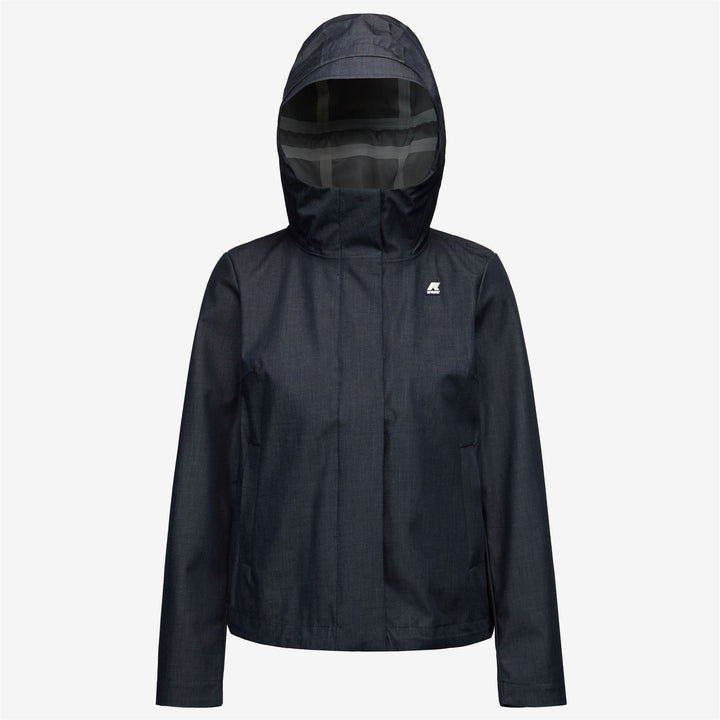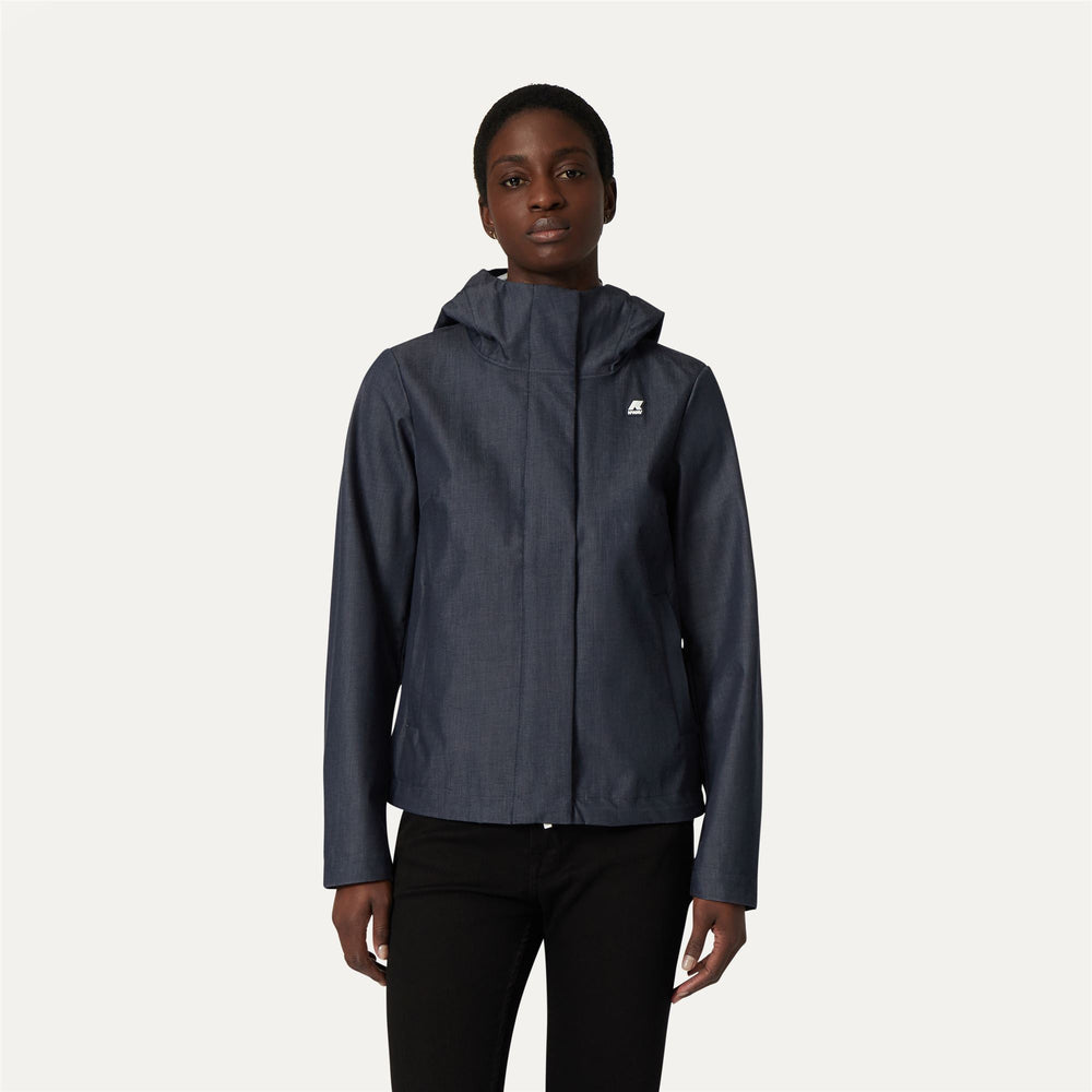 Chaqueta corta urbana para mujer en azul y beige con costuras selladas 01