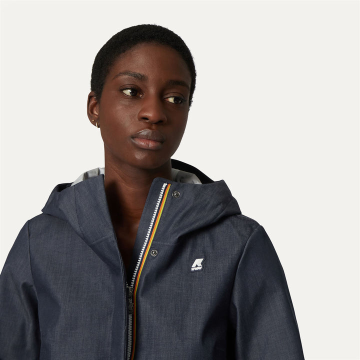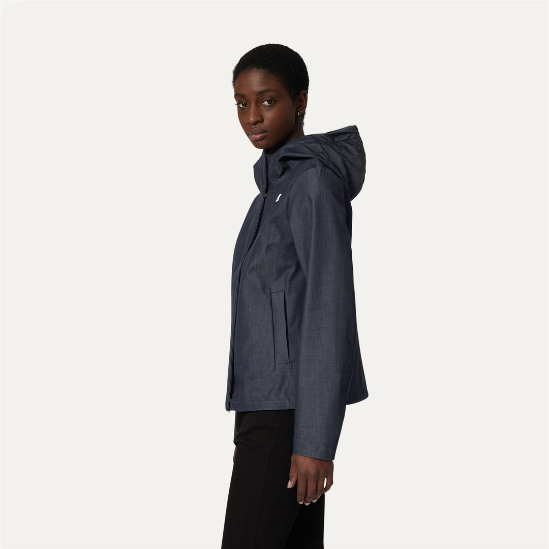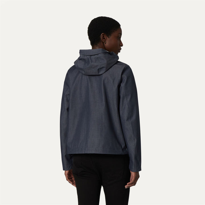 Chaqueta corta urbana para mujer en azul y beige con costuras selladas 02