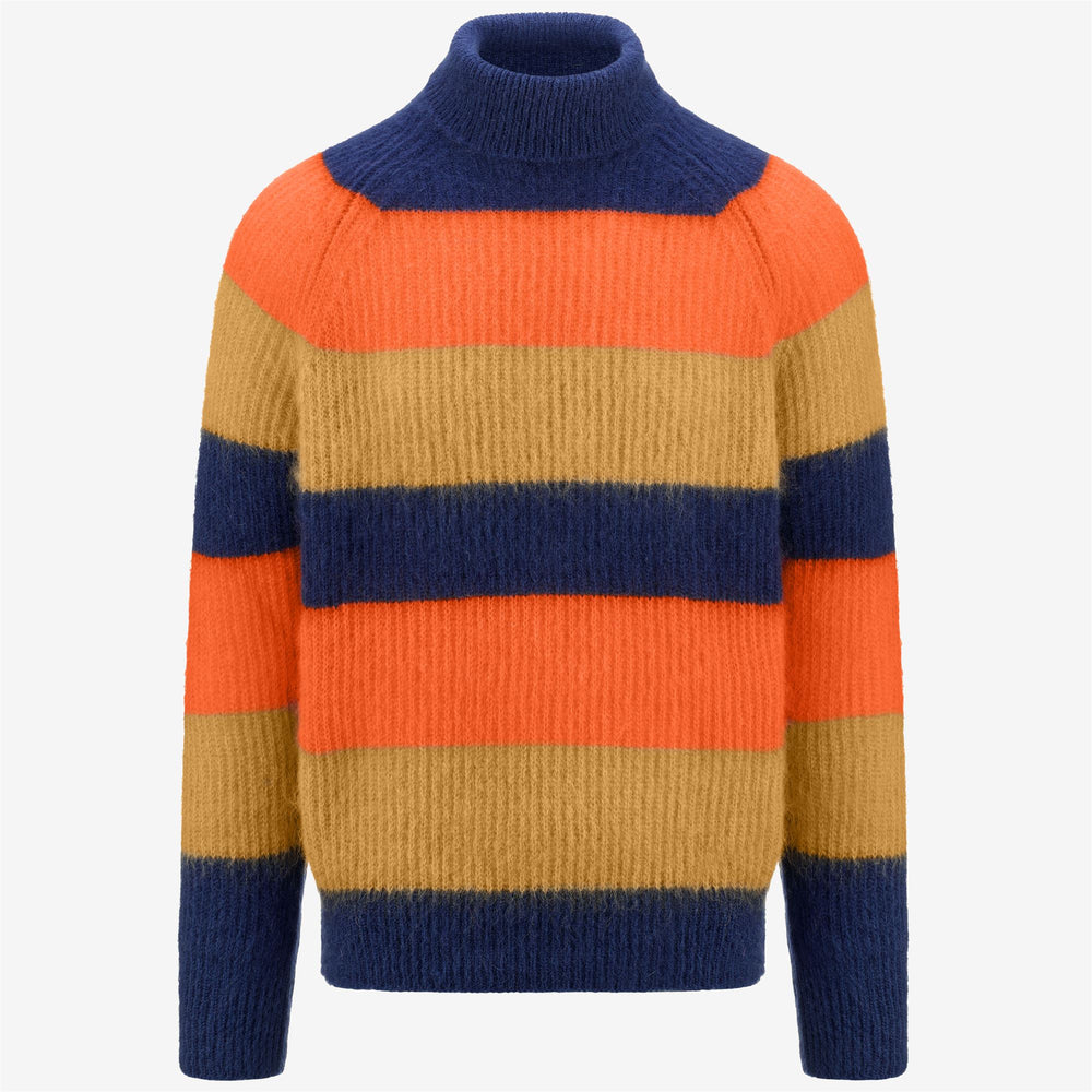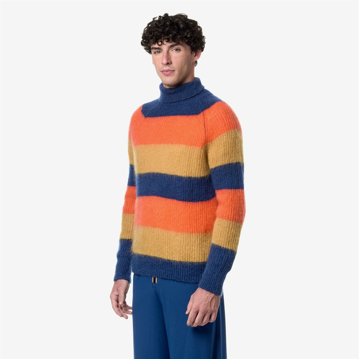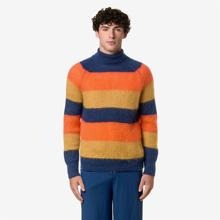 El suéter grueso de canalé Bereny para hombres está confeccionado con una mezcla de mohair, exhibiendo un diseño de intarsia de rayas que alterna entre los tres colores icónicos de K-Way. Su silueta acogedora de cuello alto cuenta con mangas raglán para un look relajado.