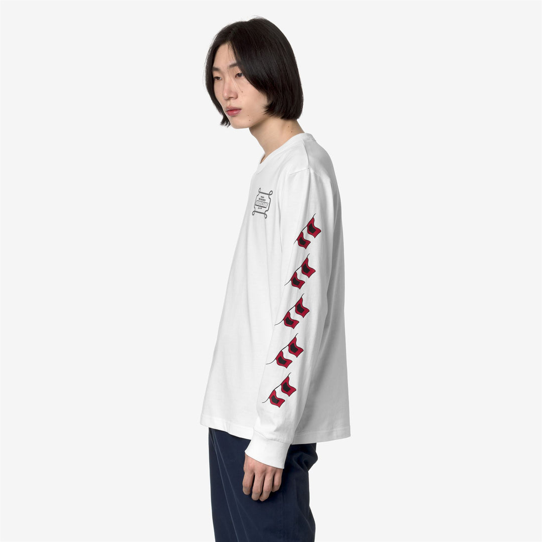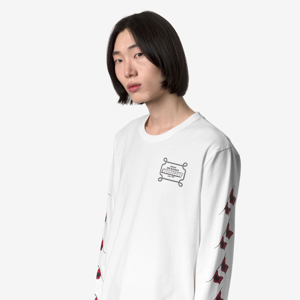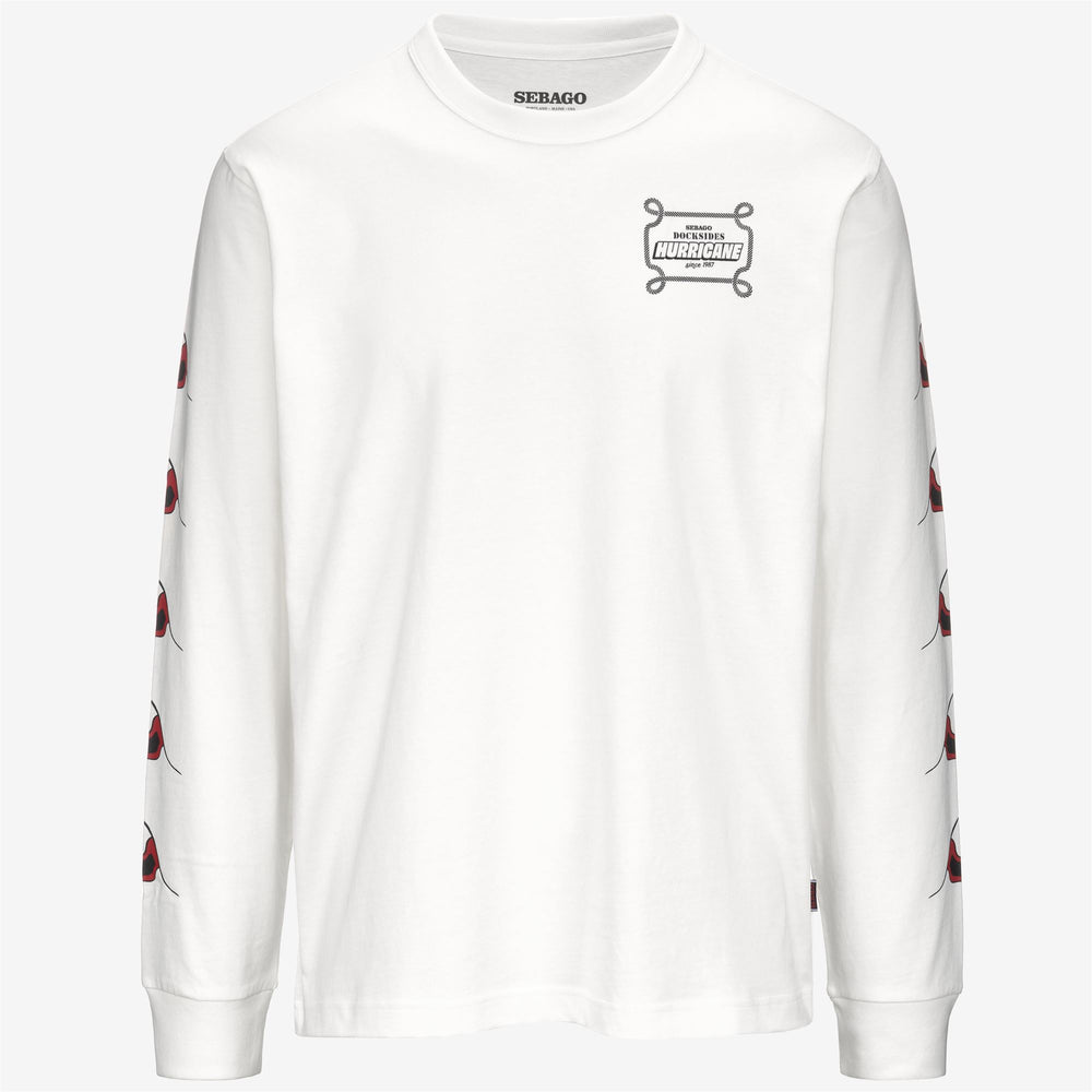 Inspirándose en un estilo de archivo de los años 80, Sebago presenta la exclusiva colección Hurricane: una pequeña selección de piezas inspiradas en el mundo de la navegación y la libertad y energía del mar abierto. La camiseta de manga larga Roxbury está elaborada con algodón, presenta un cuello redondo y puños de canalé. Decorada con banderas de advertencia impresas en las mangas y el icónico gráfico de Hurricane en el pecho.