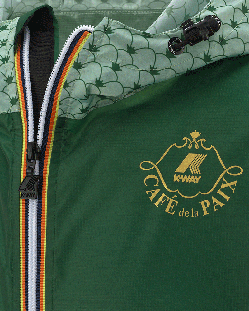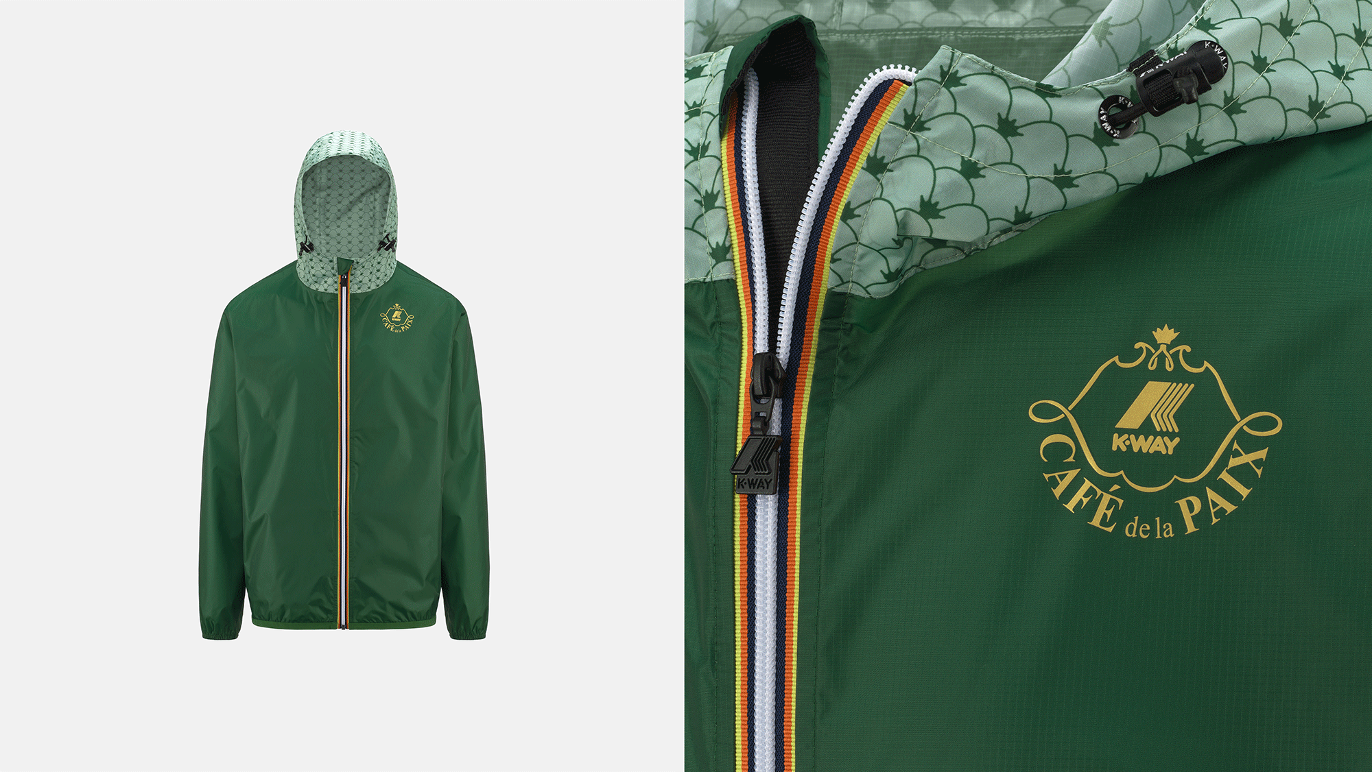 Per celebrare il legame di K-Way con il Café de la Paix è stata progettata una reinterpretazione in edizione limitata della classica giacca Claude Le Vrai 3.0 nei colori distintivi del caffè parigino. Verde per la giacca e oro per il doppio logo K-Way e Café de la Paix.