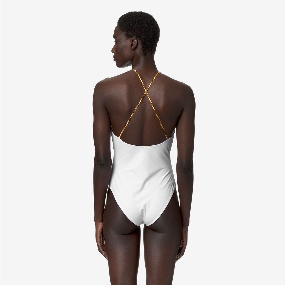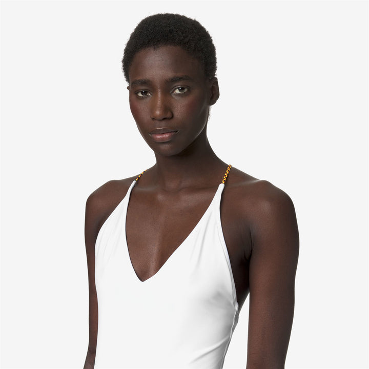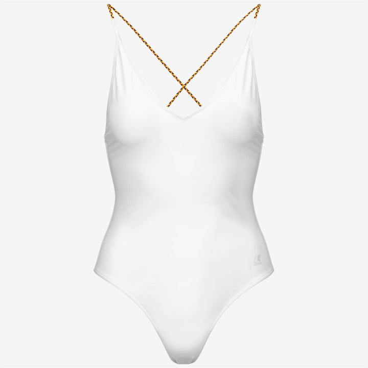 Il costume intero Crosel ha una linea slanciata e femminile con scollatura a V e logo sul fianco. Le spalline incrociate sul retro sono rifinite in tessuto intrecciato nei colori iconici K-Way.