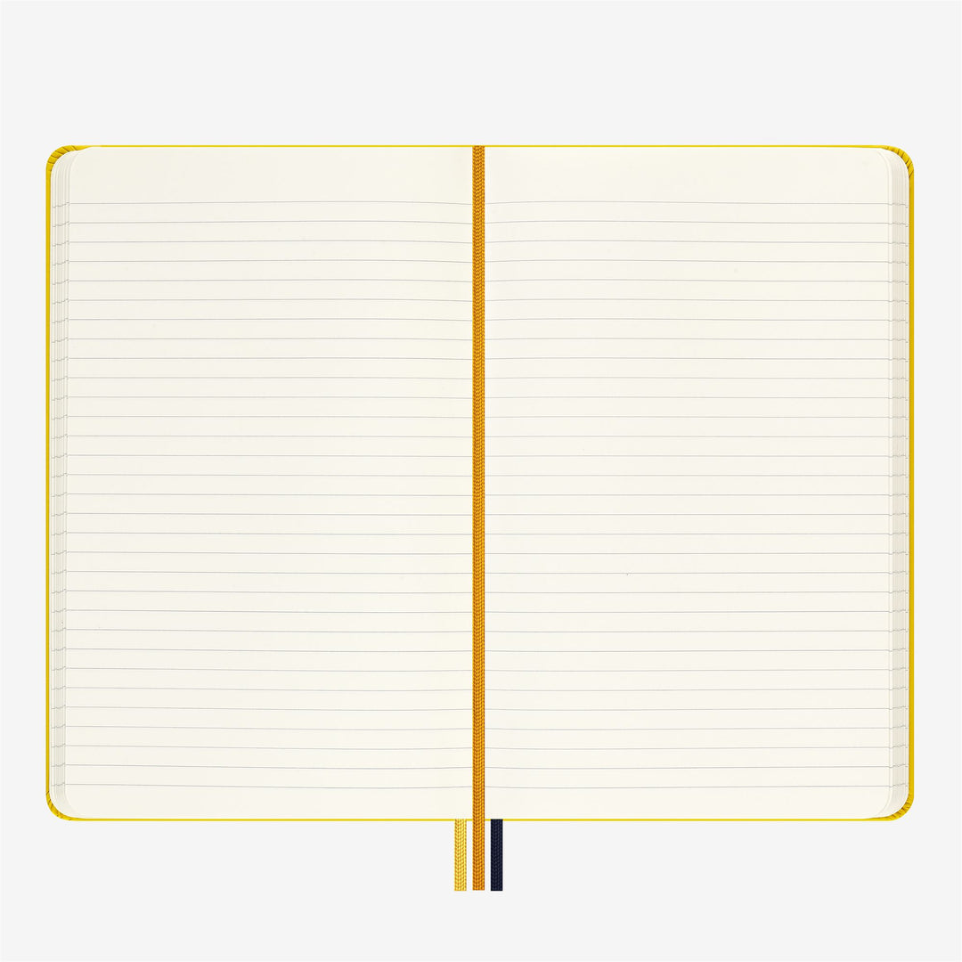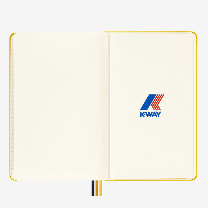 Un taccuino rivestito in tessuto con la banda elastica a righe che richiama l’inconfondibile zip del brand, tre segnalibri realizzati negli stessi colori e pagine di apertura e chiusura personalizzate con il logo K-Way.