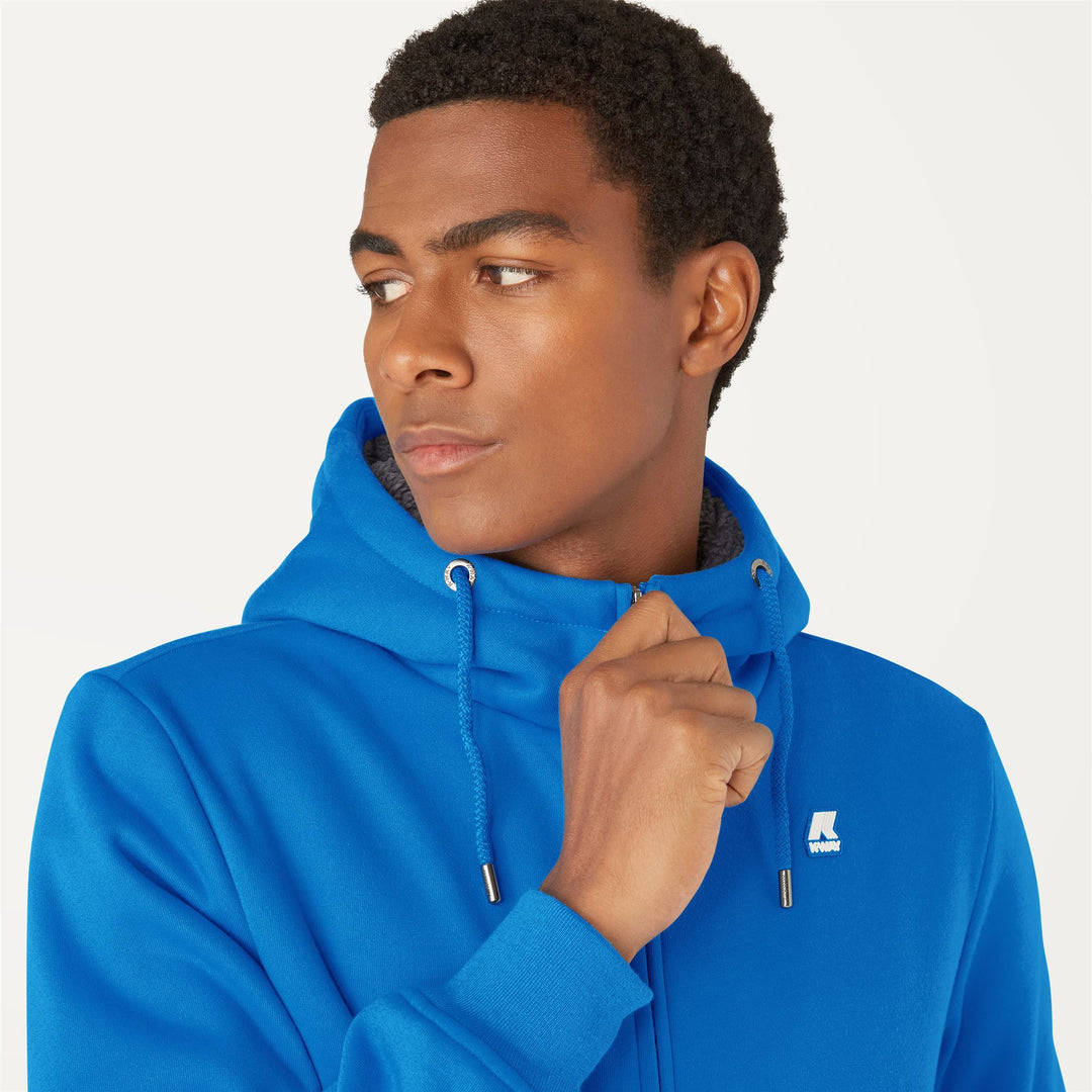 Giacca in felpa con cappuccio uomo vestibilità attillata, realizzata in felpa calda e soffice cotone 80% e poliestere 20%. Capo rivestito in orsetto 100% poliestere. Il capo è dotato di un cappuccio regolabile tramite drawcord e cord-end personalizzato K-Way. Apertura full zip K-Way con puller personalizzato K-Way in metallo. Bordi in rettilinea in tinta con il tessuto e tasca frontale a marsupio. Patch logo K-Way in silicone bianco sul fronte. QR label ed etichette interne stampate.