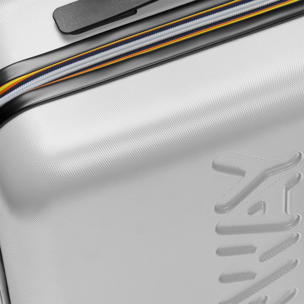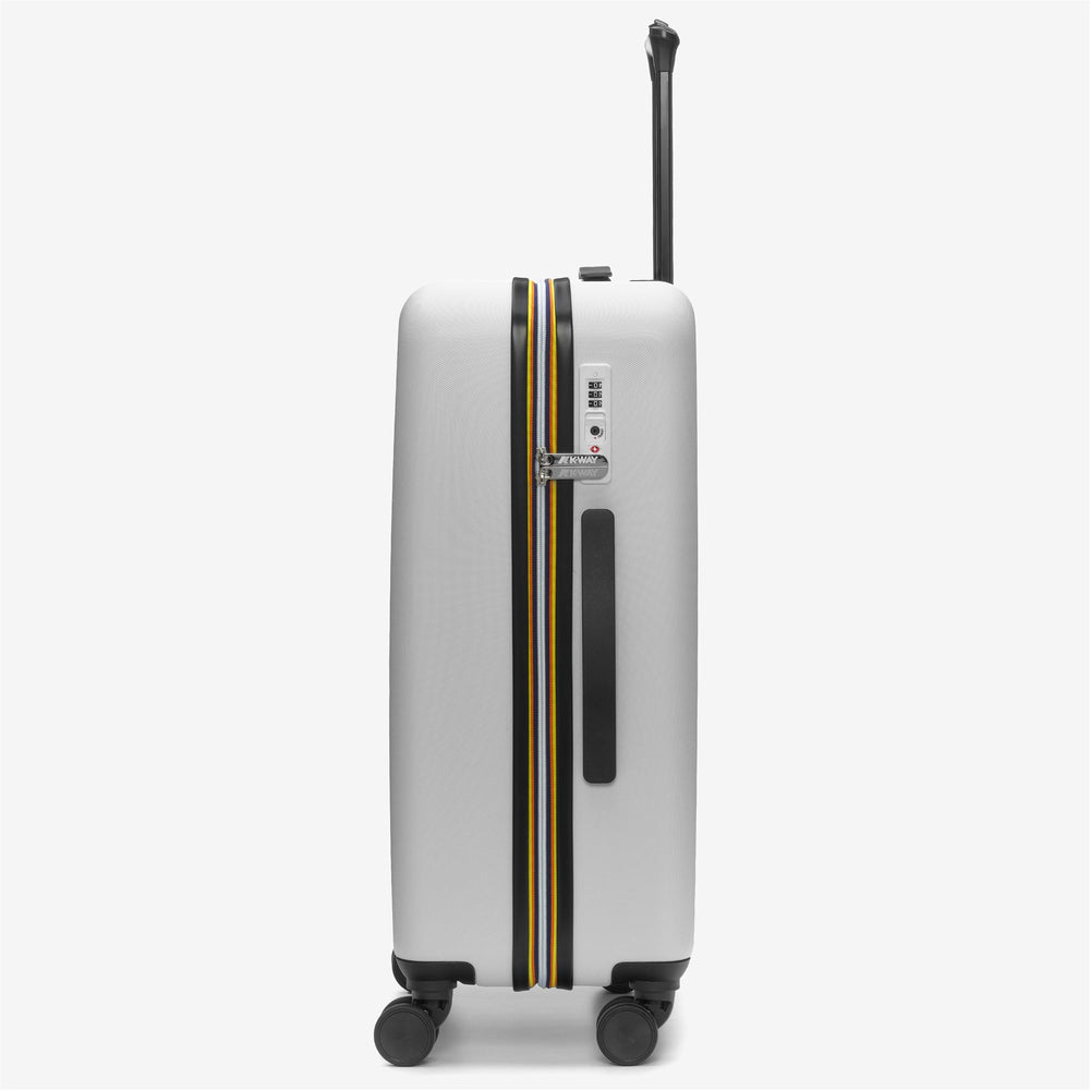 Trolley rigido da viaggio Trolley Medium con maxi logo K-Way stampato sul davanti. L'accessorio presenta quattro ruote girevoli a 360°per la massima libertà di movimento, tre tasche con zip all'interno ed elastici incrociati multicolor. Chiusura con combinazione e TSA.