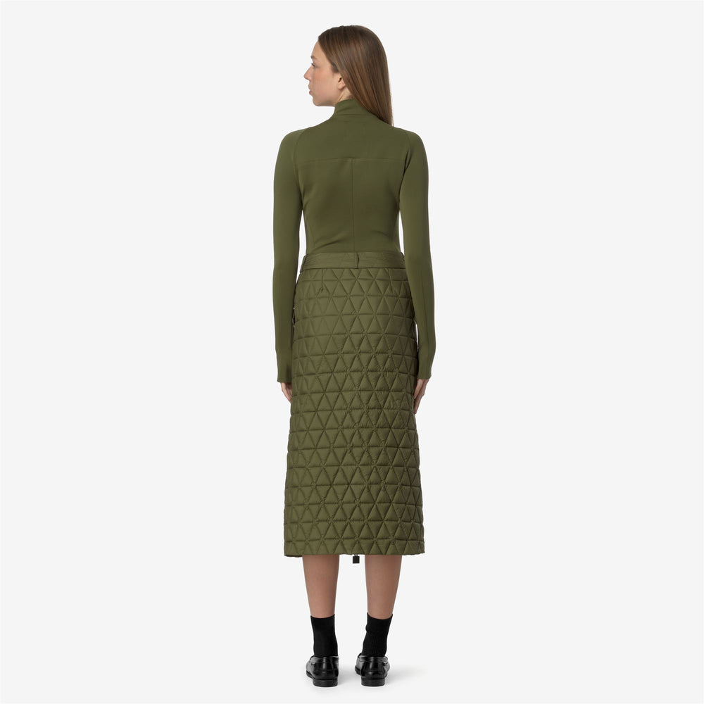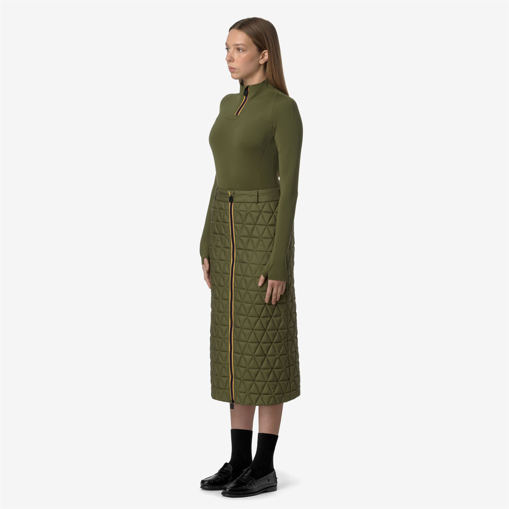 Maralie è una gonna lunga che interpreta con giochi di volumi e geometrie i look più contemporanei. Questo capo presenta una costruzione funzionale adatta ai primi freddi: un tessuto esterno trapuntato con leggero trattamento antipioggia e imbottitura in Thermore, una fibra ricavata dal poliestere riciclato. La gonna si distingue per la linea allungata, chiusura full zip nei colori iconici del tape K-Way, vita con passanti per cintura e tasche laterali.