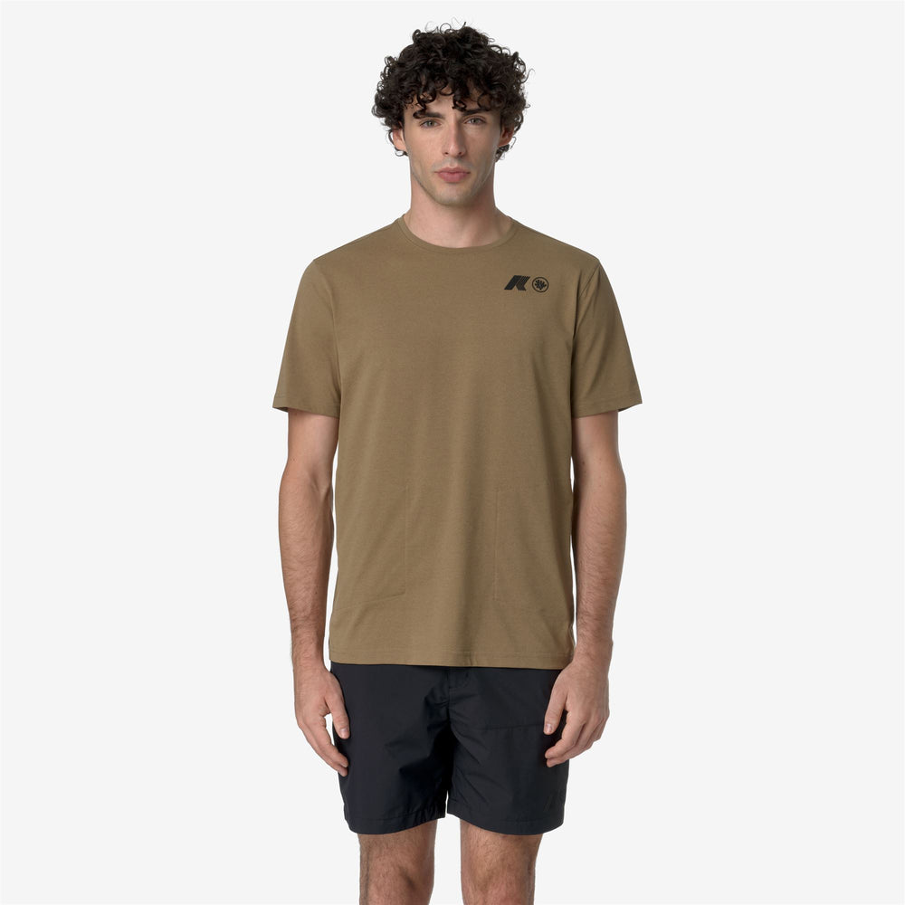 T-shirt a maniche corte impacchettabile, realizzata in jersey di polyestere riciclato. Tasca impacchetabile con sacco tasca in mesh di colore azzurro. Personalizzato con il logo K-WAY x CORAL GARDENERS.