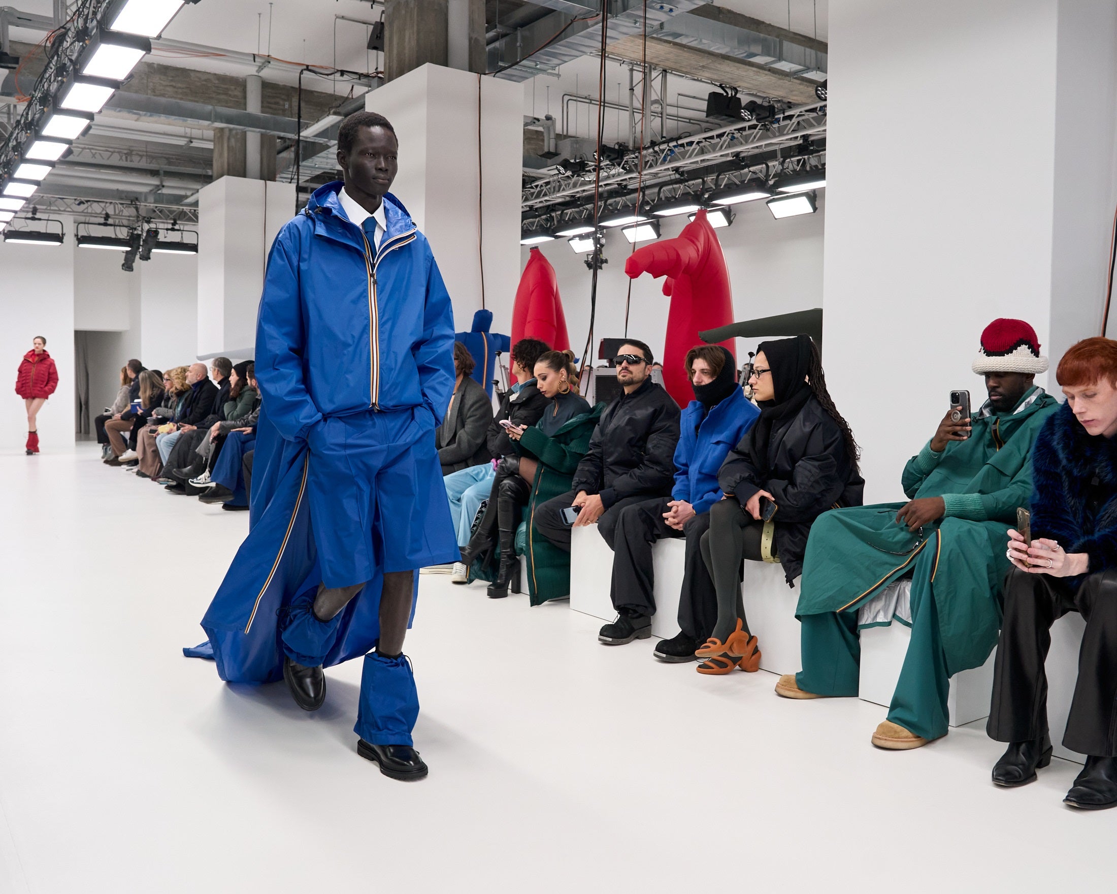 The garment's structure rises towards classics directions, engaging in layering, lines, and patterns. From the iconic tricolor zipper, the K-Way style influences jackets, tops and trousers with a compact volume, made with materials that combine boldness and versatility.