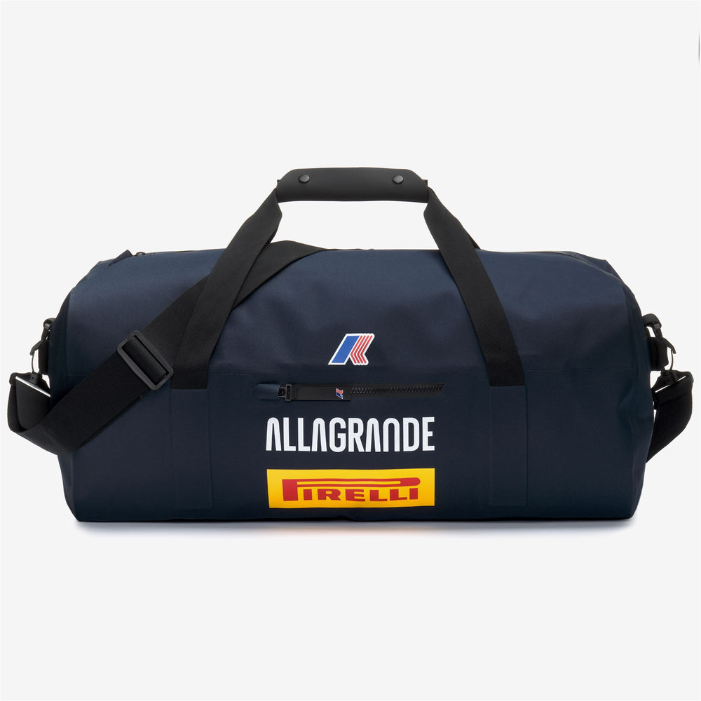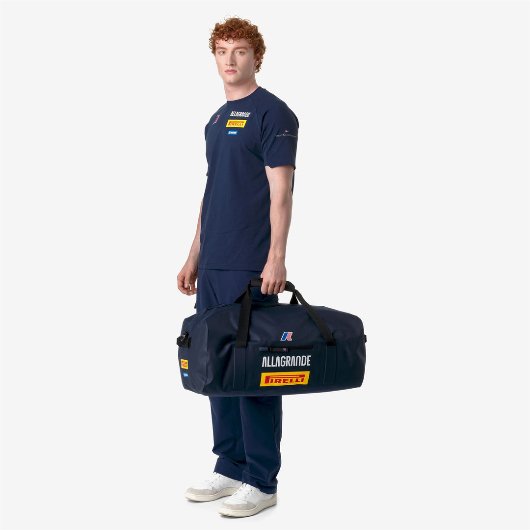 SANARY ALLAGRANDE is K-Way's technical duffle bag, ideal for every adventure away from home. It celebrates the sponsorship of Allagrande Pirelli, the Classe 40 boat helmed by skipper Ambrogio Beccaria. Crafted from waterproof technical fabric with a PVC coating, it features a main opening with a waterproof zip and a customized K-Way puller. The duffle bag is equipped with grosgrain side handles and reinforced with a snap closure. It also includes a removable grosgrain tape shoulder strap. The exterior side pocket with a zip mirrors the design of the shoulder covers. Inside, there is a mesh pocket with a zip closure. The design is completed with printed K-Way, Allagrande Pirelli, and Mapei logos.