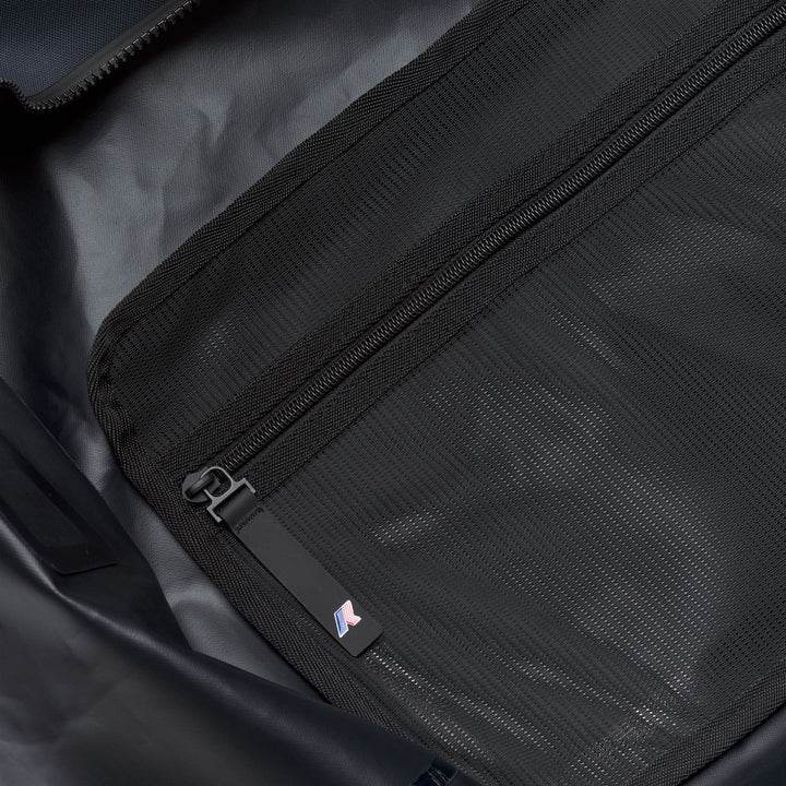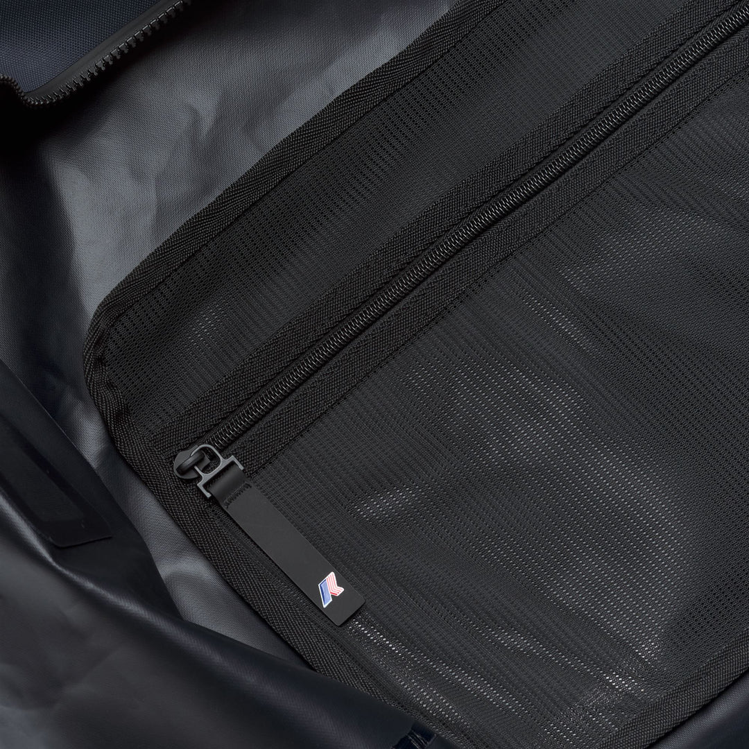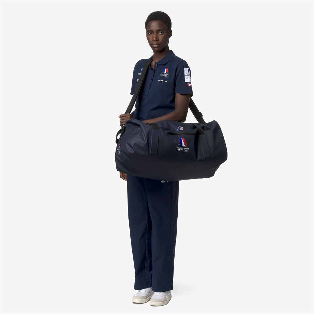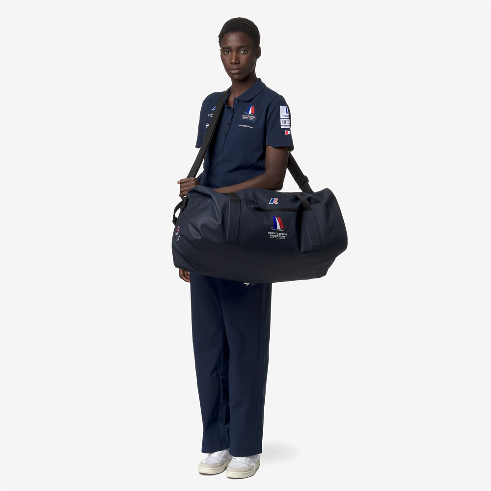 SANARY ORIENT EXPRESS TEAM AC is the technical duffle bag by K-Way, perfect for every adventure away from home, created to celebrate the sponsorship of the Orient Express Racing Team for the 37th America's Cup. Made from waterproof technical fabric with PVC coating, it features a main opening system with a waterproof zipper and a custom puller with the K-Way logo. Side handles in grosgrain and reinforcement with snap closure. Removable shoulder strap in grosgrain tape. External side pocket with zipper following the design reminiscent of the outerwear. Internal mesh pocket with zipper closure. Printed logos of K-Way, Orient Express, America's Cup, and sponsors. Dimensions: H 27 x L 60 x W 33 cm.
