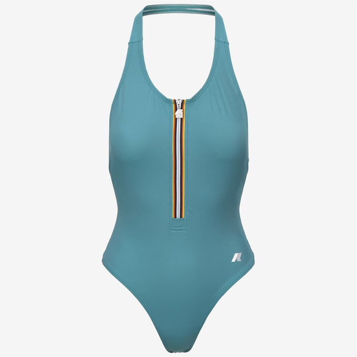 The Sylvie one-piece swimsuit boasts a feminine halterneck silhouette with a long front zip, embellished with K-Way's iconic striped tape. Crafted from resistant quick-dry Lycra®, the design is detailed with a coloured K-Way logo on the side.