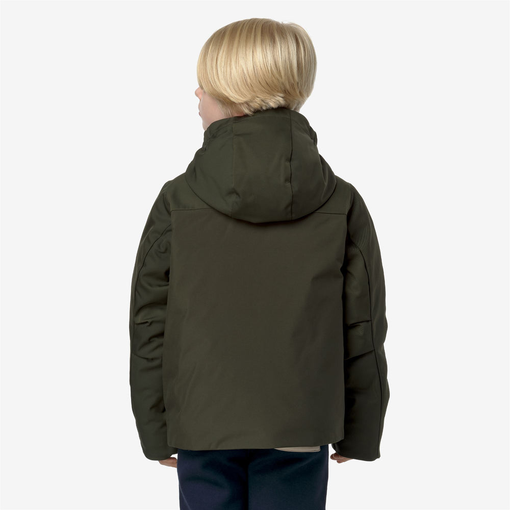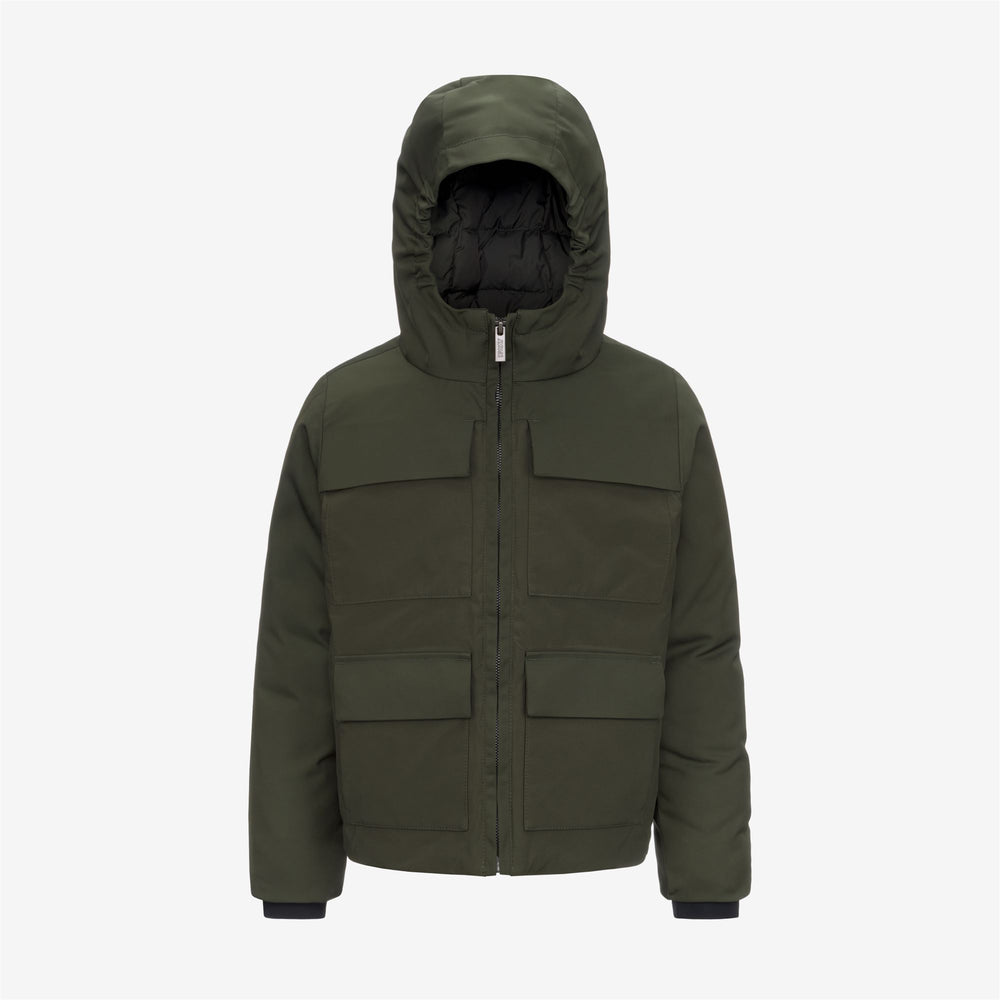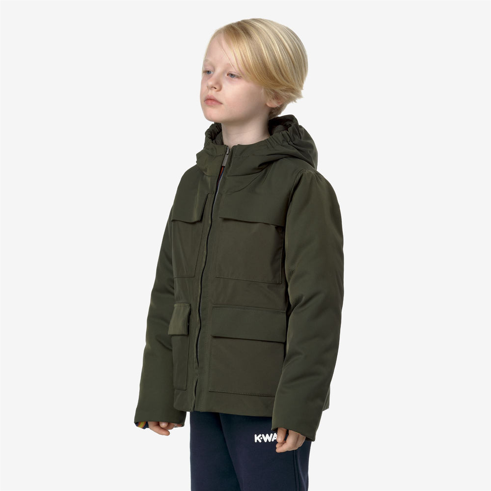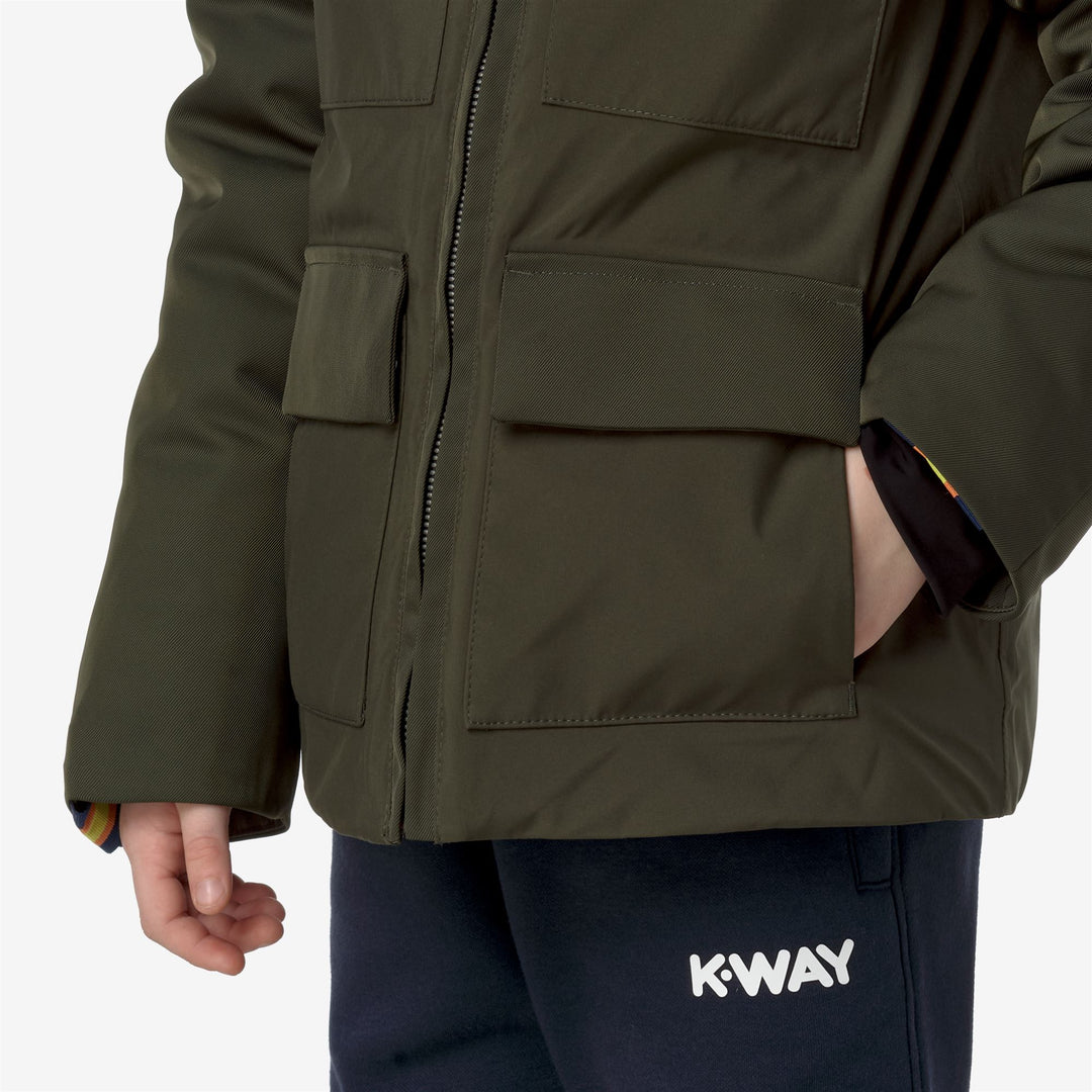 Hodin is a short children's jacket, ideal for winter, with a dynamic and clean look perfect for the city thanks to its functional details and the absence of logos on the front. This jacket, with a regular fit and zip closure, features a waterproof nylon exterior combined with twill-pattern fabric inserts and a Molina down padding that ensures a medium level of warmth. The model has a snug, adjustable hood, 4 flap pockets with snap buttons, and the K-Way tape detail on the cuff.