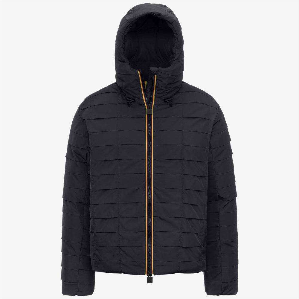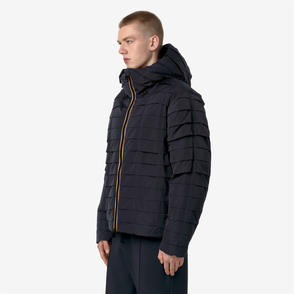 Clauder is a men's short jacket, a style statement for the coldest days. This garment features a textured look and a functional construction: pleated outer fabric with a light water-repellent finish and a recycled goose down padding. The jacket stands out with its boxy cut, full zip closure in the iconic K-Way tape colors, adjustable hood, and pockets with invisible buttons.