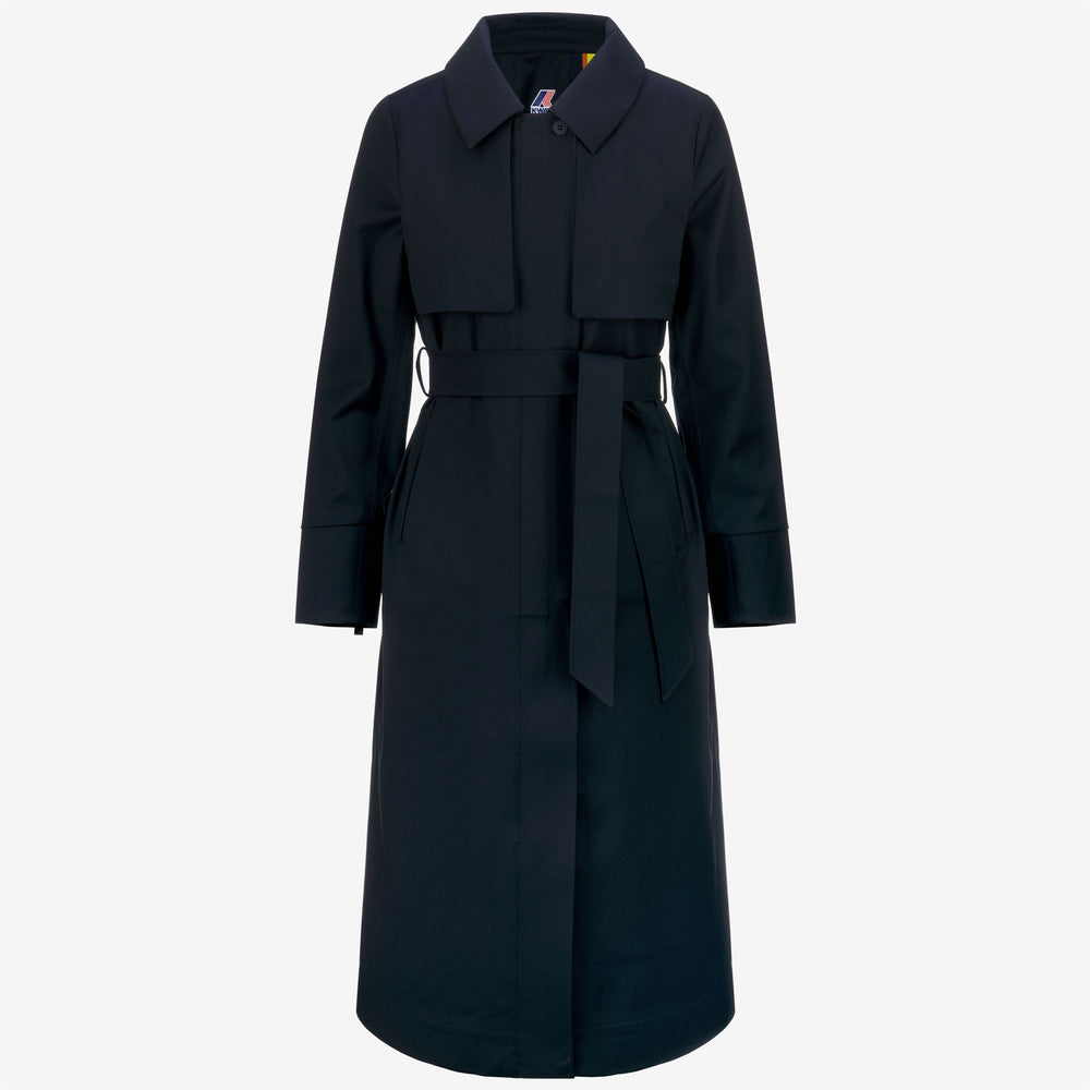 Jesel is a full-length women's coat, ideal for autumn, that reinterprets the classic rain trench with an urban-lifestyle and contemporary twist. This outerwear accentuates the feminine silhouette with a waist belt and features a water-repellent technical wool shell, an internal membrane, and a soft fleece lining with heat-taped seams. It stands out for its clean lines, thanks to the hidden zip closure with a tone-on-tone button and the absence of front logos. The model includes pockets with concealed buttons and the K-Way tape detail on the cuff.