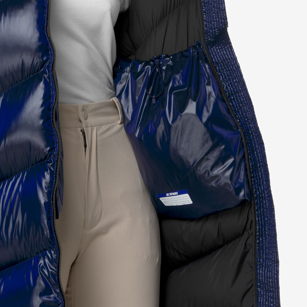Neivel is a full-length women's jacket with a contemporary lifestyle appeal, featuring an essential quilted design with no front logos. Designed for very cold temperatures, this jacket offers a regular fit and is crafted with a glossy, iridescent, and heathered diamond quilted nylon exterior. The down insulation ensures a high warmth level and gives the jacket an exceptionally light and fluffy appearance. The model includes an enveloping, adjustable hood, two side pockets, elastic cuffs, and the K-Way tape detail on the cuff.