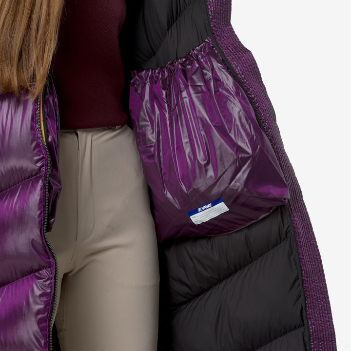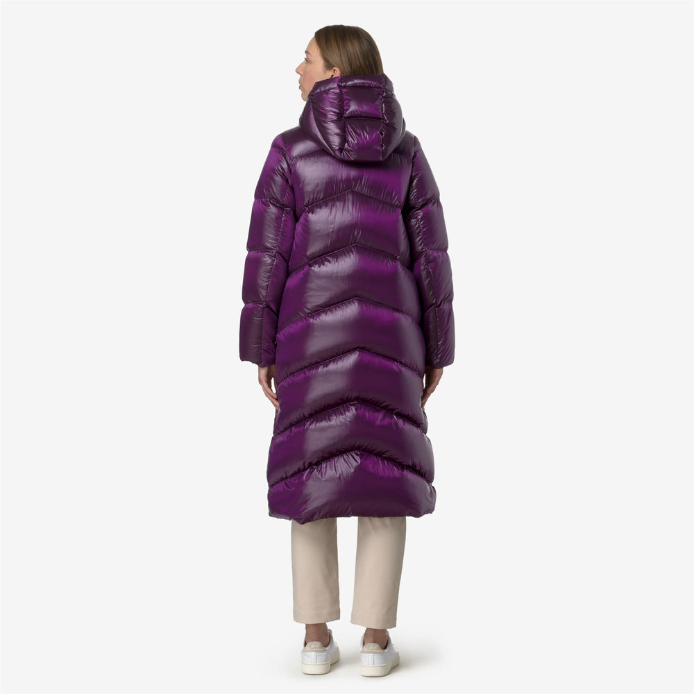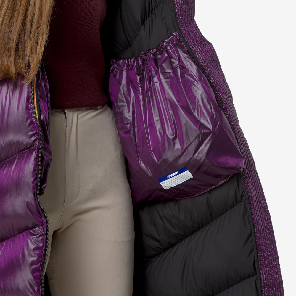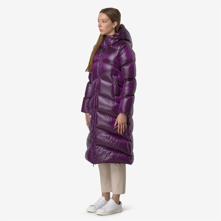 Neivel is a full-length women's jacket with a contemporary lifestyle appeal, featuring an essential quilted design with no front logos. Designed for very cold temperatures, this jacket offers a regular fit and is crafted with a glossy, iridescent, and heathered diamond quilted nylon exterior. The down insulation ensures a high warmth level and gives the jacket an exceptionally light and fluffy appearance. The model includes an enveloping, adjustable hood, two side pockets, elastic cuffs, and the K-Way tape detail on the cuff.