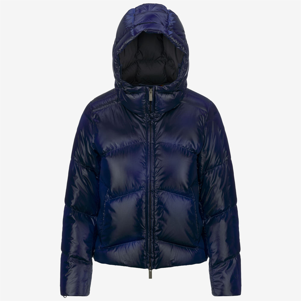 Ninev is a women's short quilted jacket with a contemporary lifestyle appeal and a clean look with no logos on the front. This jacket, with its regular fit, is designed for the coldest weather, with an outer diamond quilted pattern made from glossy, iridescent, chintz-like fabric. The down insulation provides a high warmth grade and gifts the outerwear with an airy, almost cloudy appearance. This style features an adjustable wrap-around hood, 2 side pockets, elasticated cuffs, and the K-Way tape detail on the cuff.