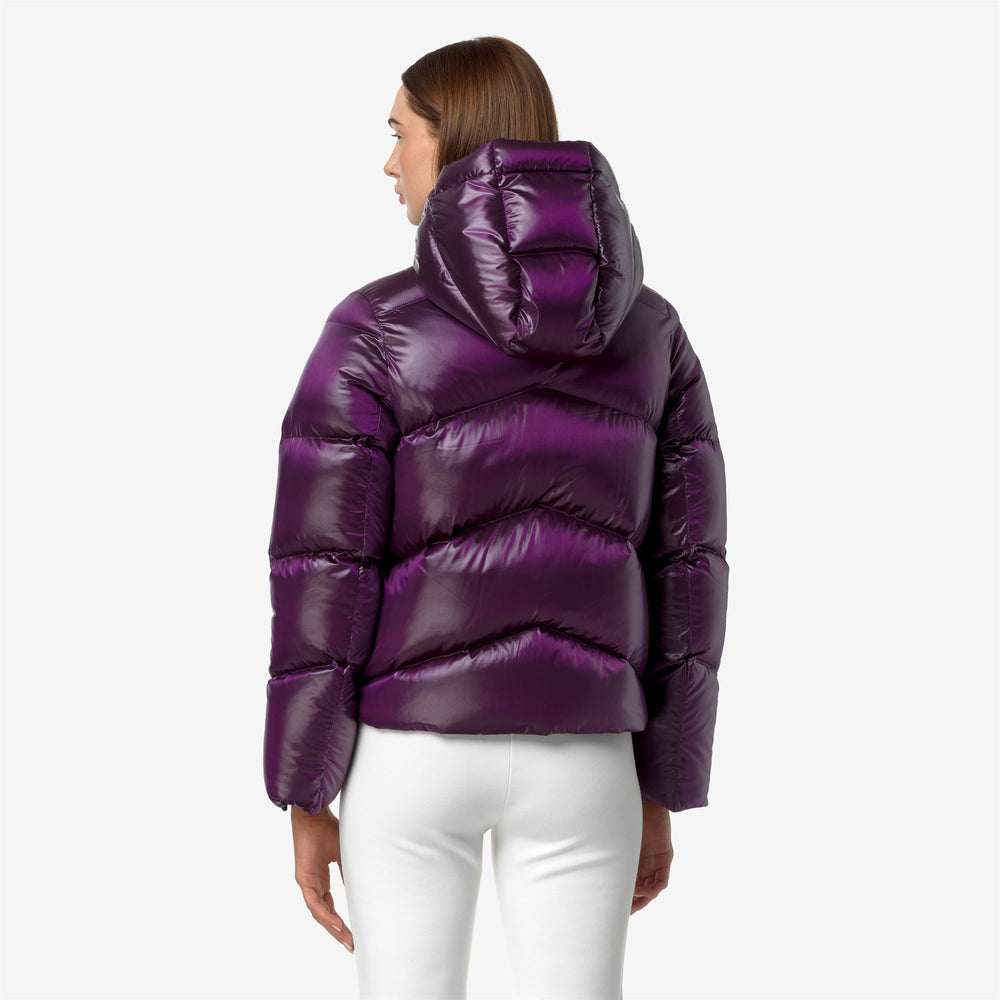 Ninev is a women's short quilted jacket with a contemporary lifestyle appeal and a clean look with no logos on the front. This jacket, with its regular fit, is designed for the coldest weather, with an outer diamond quilted pattern made from glossy, iridescent, chintz-like fabric. The down insulation provides a high warmth grade and gifts the outerwear with an airy, almost cloudy appearance. This style features an adjustable wrap-around hood, 2 side pockets, elasticated cuffs, and the K-Way tape detail on the cuff.