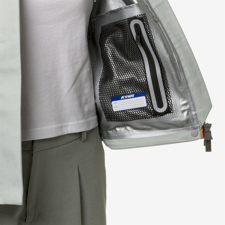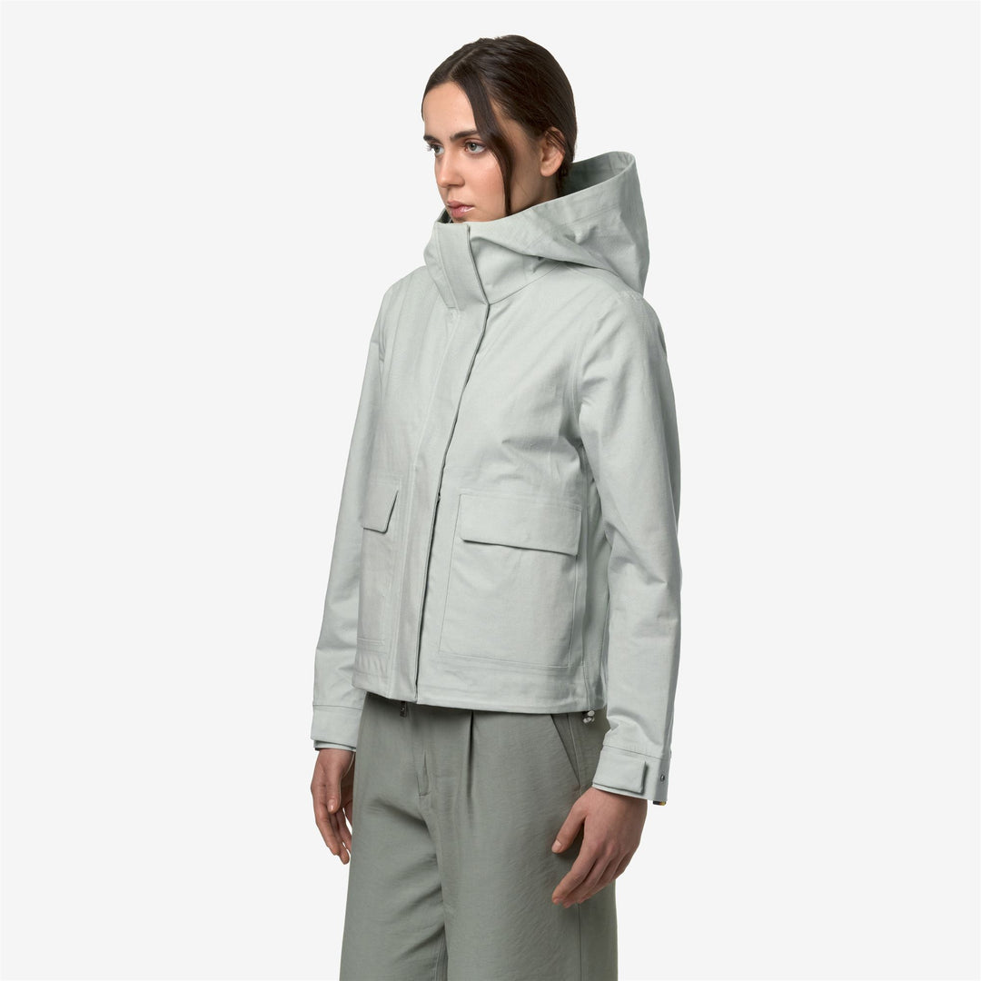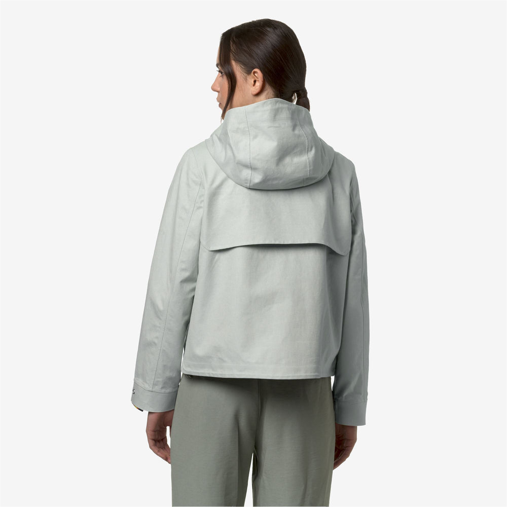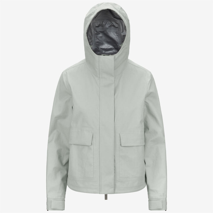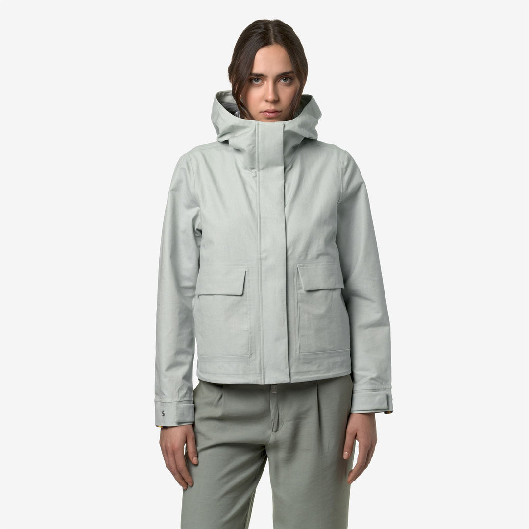 Sarthe is a women's short jacket that seamlessly blend natural materials and K-Way technology. Its soft-feel linen blend fabric combines with a functional waterproof membrane on the inside, allowing for versatile wear. Some stylish and functional details complete the jacket's design: the adjustable cuffs, which are adorned with colorful K-Way tape, a fixed hood, two practical flap pockets, and small ventilation openings under the arms.
