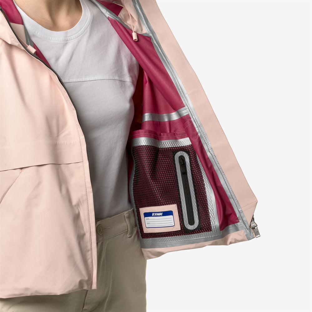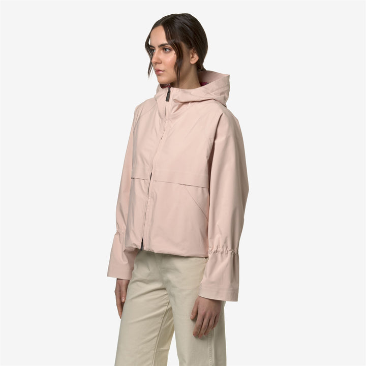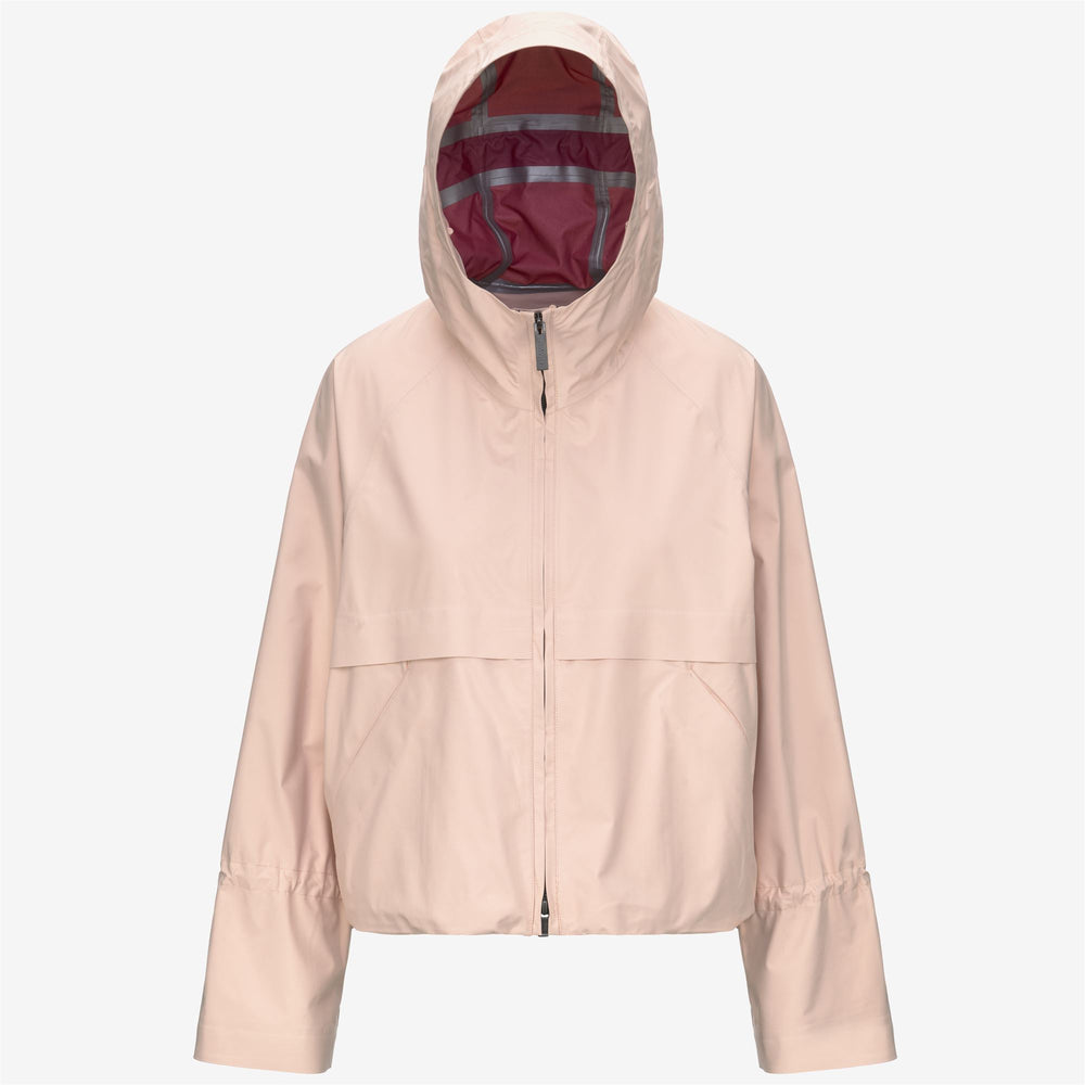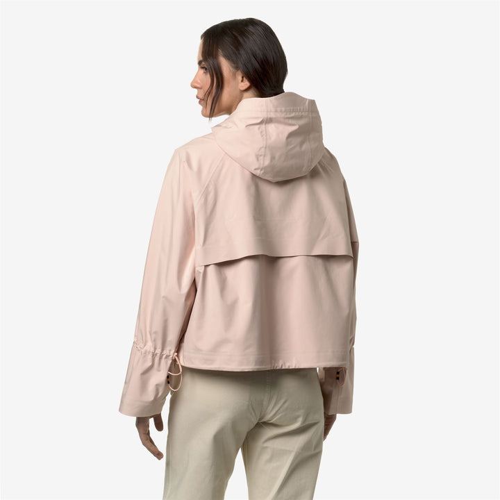 Soille is a women's short jacket with a clean, functional-chic style. This outerwear piece consists of an outer layer made of water-repellent technical fabric, a waterproof membrane, and a softer inner layer for superior comfort when worn. The full-zip, cropped design features an enveloping hood, adjustable waist and cuffs with drawstrings, and two side pockets with zipper closures. Seams and zippers have been subtly integrated to enhance the sleekness of the lines, while the hems are bonded for a raw cut effect. The iconic K-Way tape on the back adds a distinctive graphic detail.