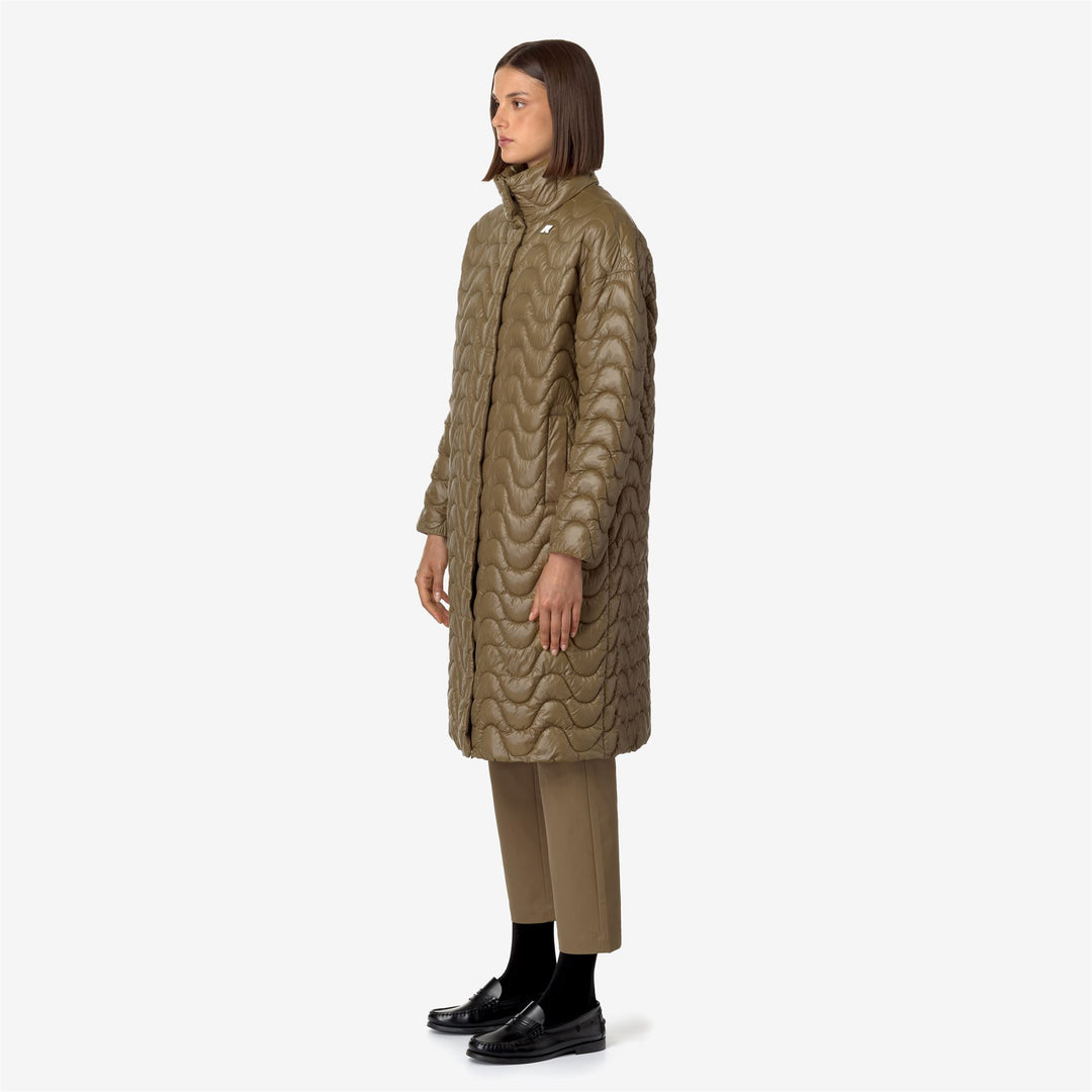Sonja is an extra-long jacket for women with an "A" line silhouette, with a comfortable fit and contemporary city-ready design. The high collar and full zip closure with protective flap give a clean and sleek look to this outerwear piece. Made from recycled water-resistant and windproof nylon, it features a quilted wave texture for a distinctive graphic touch and a polyester padding which provides a medium warmth grade. The innovative padding of this outerwear piece is made from Thermore®, a highly insulating fiber obtained from recycled plastic.