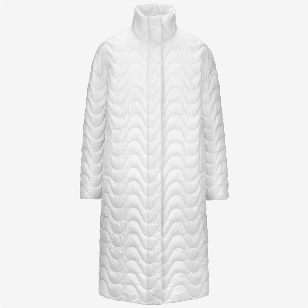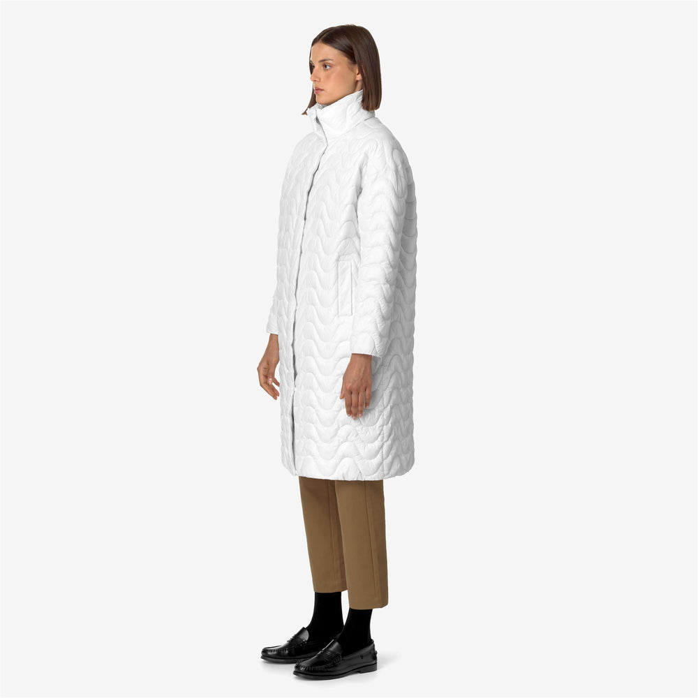 Sonja is an extra-long jacket for women with an "A" line silhouette, with a comfortable fit and contemporary city-ready design. The high collar and full zip closure with protective flap give a clean and sleek look to this outerwear piece. Made from recycled water-resistant and windproof nylon, it features a quilted wave texture for a distinctive graphic touch and a polyester padding which provides a medium warmth grade. The innovative padding of this outerwear piece is made from Thermore®, a highly insulating fiber obtained from recycled plastic.