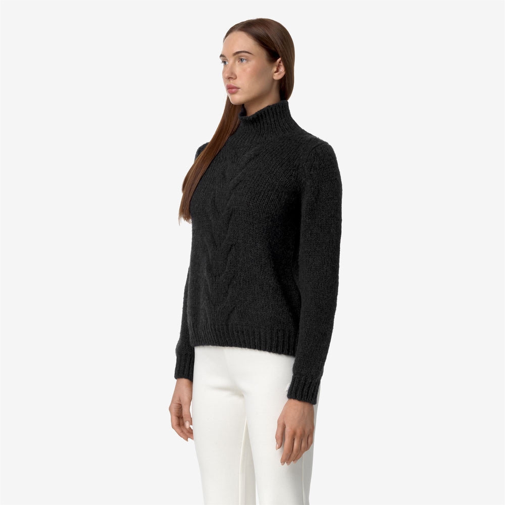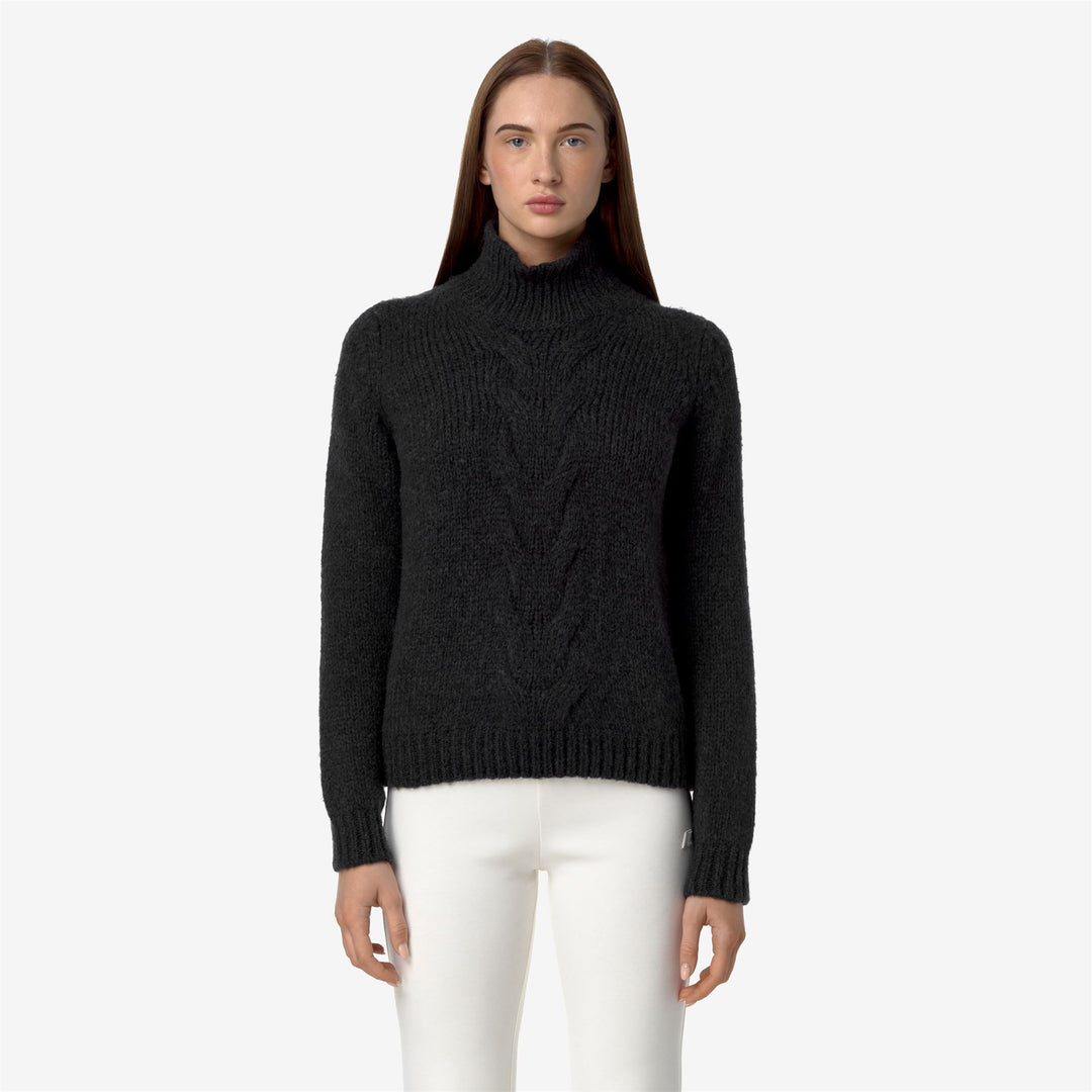 Fuzzy is a women's high collar sweater which boasts a refined, cozy, and contemporary look, ideal for both casual and formal occasions. It's crafted with a warm and cozy premium blend of merino wool, featuring a cable knit pattern on the front. This style has a regular fit with ribbed collar, hem and cuffs. The K-Way logo detail stands out on the side of the garment.