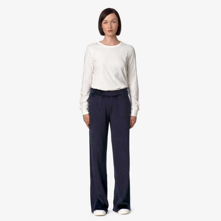 The Jenny women's pants are distinguished by their soft, cozy design with a lifestyle appeal and are crafted from a combination of different colors and fabrics. The exterior features smooth, velvety fleece with a subtle shine, while the interior is lined with sherpa-effect fleece, offering medium warmth suitable for mid-season wear. These flare-cut pants highlight the feminine silhouette with a fitted leg that flares at the bottom and an adjustable drawstring waistband.
