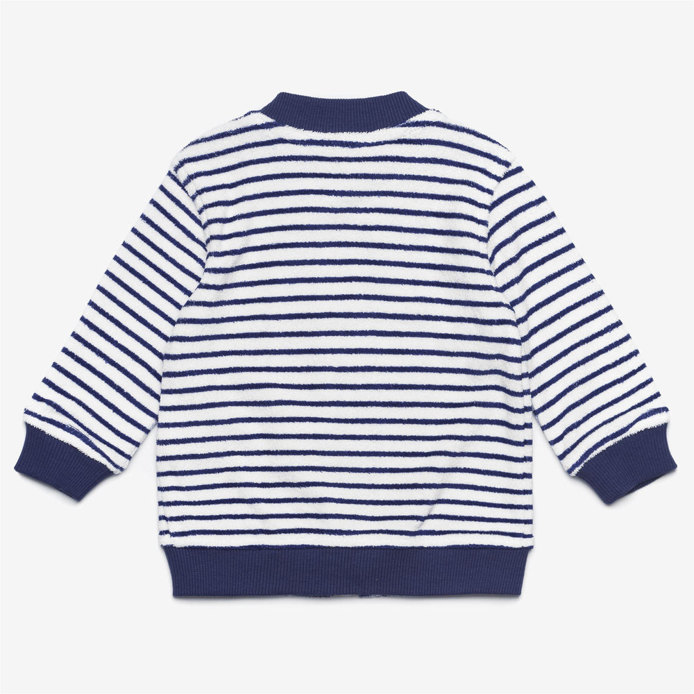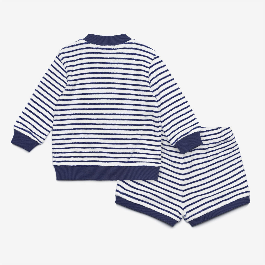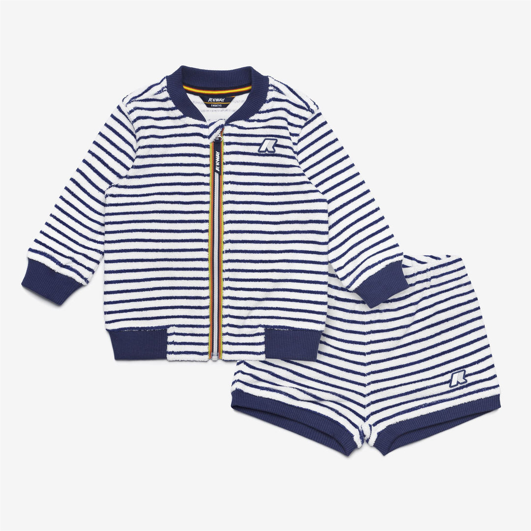 This newborn baby set, ideal for those cool summer evenings, consists of a bomber jacket-style sweatshirt with zip closure and a pair of shorts with a striped pattern with an elasticated waistband. The garments, made from soft cotton terry, feature a delicate colour contrast, a comfortable fit and ribbed hems.